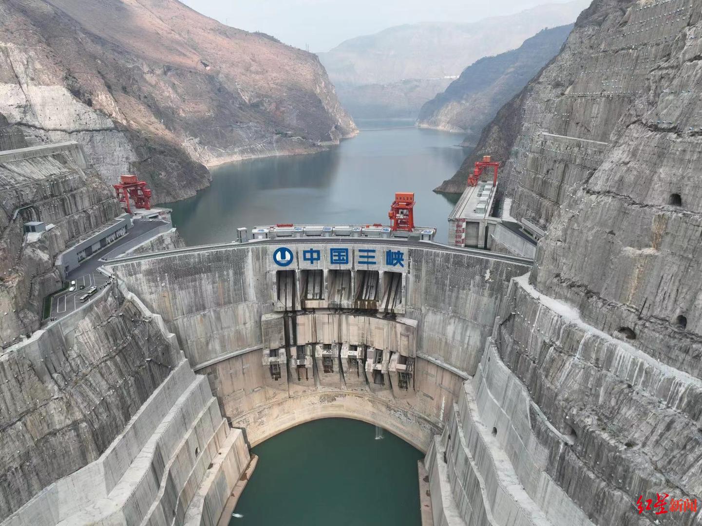 红星新闻记者站在乌东德水电站大坝上,云开雨歇,温暖的冬日阳光洒出一片耀眼的金色。乌东德大坝最大坝高270米,平均厚度40米,厚高比仅为0.19,是目前世界上最薄的300米级双曲拱坝,也是世界首座全坝应用低热水泥混凝土浇筑的特高拱坝。