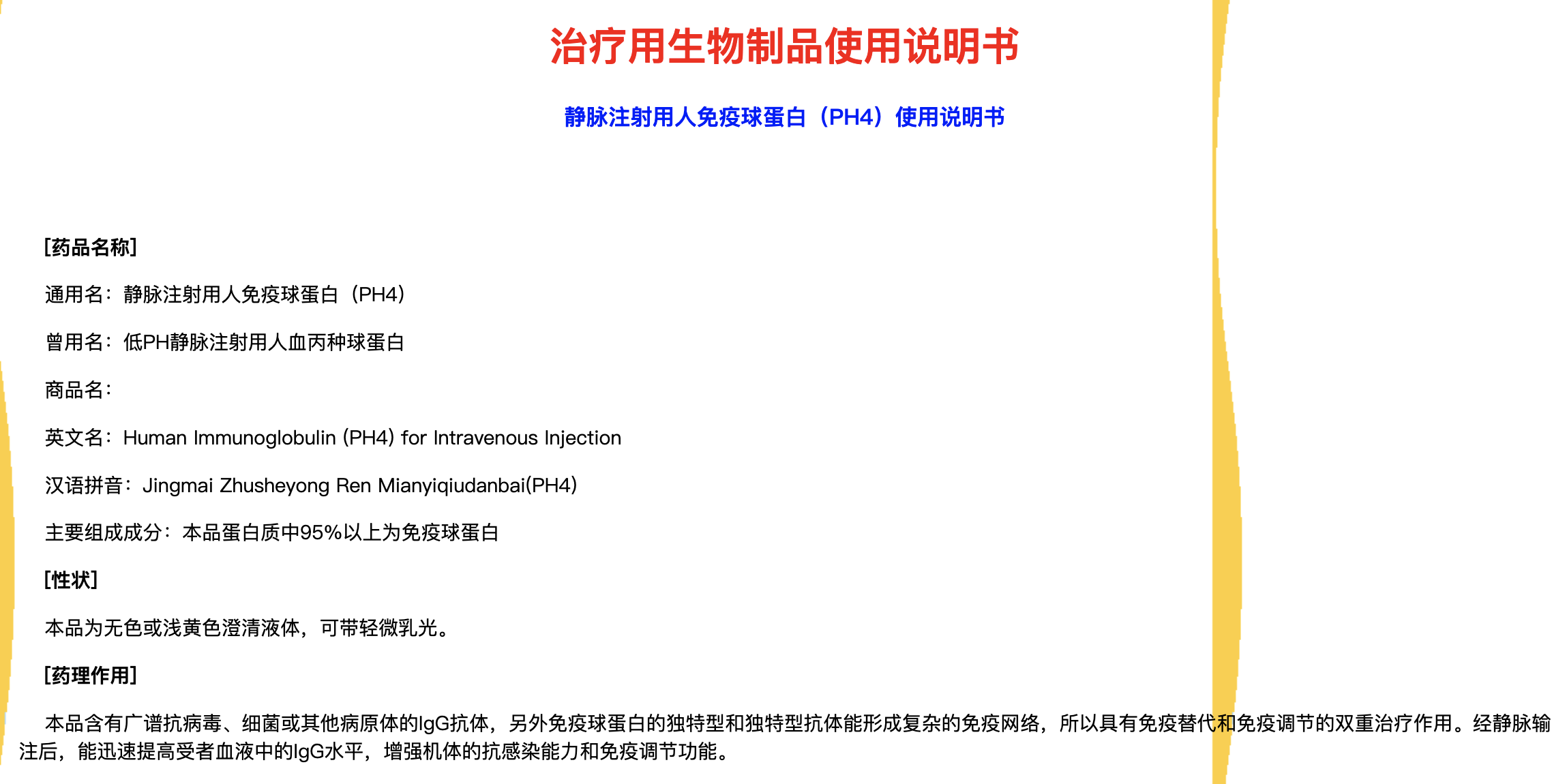 国家药监局的静注人免疫球蛋白(PH4)使用说明书显示,本品蛋白质中95%以上为免疫球蛋白,含有广谱抗病毒、细菌或其他病原体的IgG抗体。经静脉输注后,能迅速提高受者血液中的IgG(免疫球蛋白G)水平,增强机体的抗感染能力和免疫调节功能。