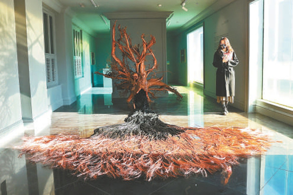 运用树根、电缆创作的装置作品《铜树》吸引观众驻足欣赏。本报记者白继开摄