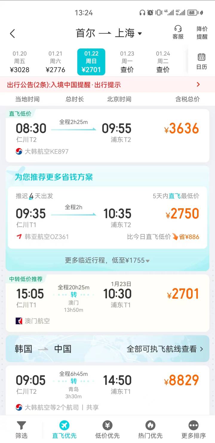 记者1月9日通过去哪儿旅行App查询发现,国内的票务网站上,1月内仍有韩国飞往内地的机票在售,并未像韩国票务网站一样“一票难求”。1月15日首尔-上海含税直飞价格为6453元,1月22日首尔-青岛含税直飞价格为2390元,1月22日首尔-南京含税直飞价格为2423元。