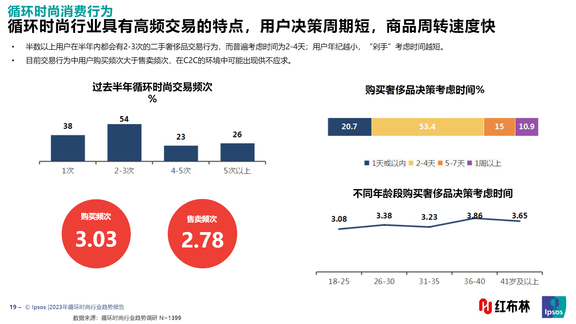 循环时尚的新潮和环保特性,驱动用户规模增长。报告显示,在半年内,有54%的用户出现过2到3次的二手奢侈品交易行为。他们从计划购买到真正“剁手”的持续时间仅为2到4天。