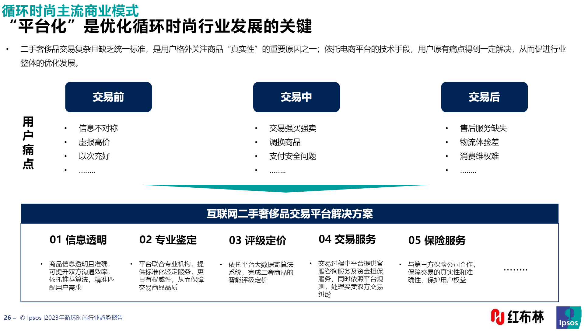 “平台化”是循环时尚行业发展的“最优解”。报告透露,由于二手奢侈品交易本身缺乏统一标准,聚焦于交易前、中、后不同阶段的用户痛点,循环时尚电商服务平台未来将能通过专业化鉴定、透明化商品、大数据定价等方式,巧妙解决用户在交易过程中的种种“不放心”。