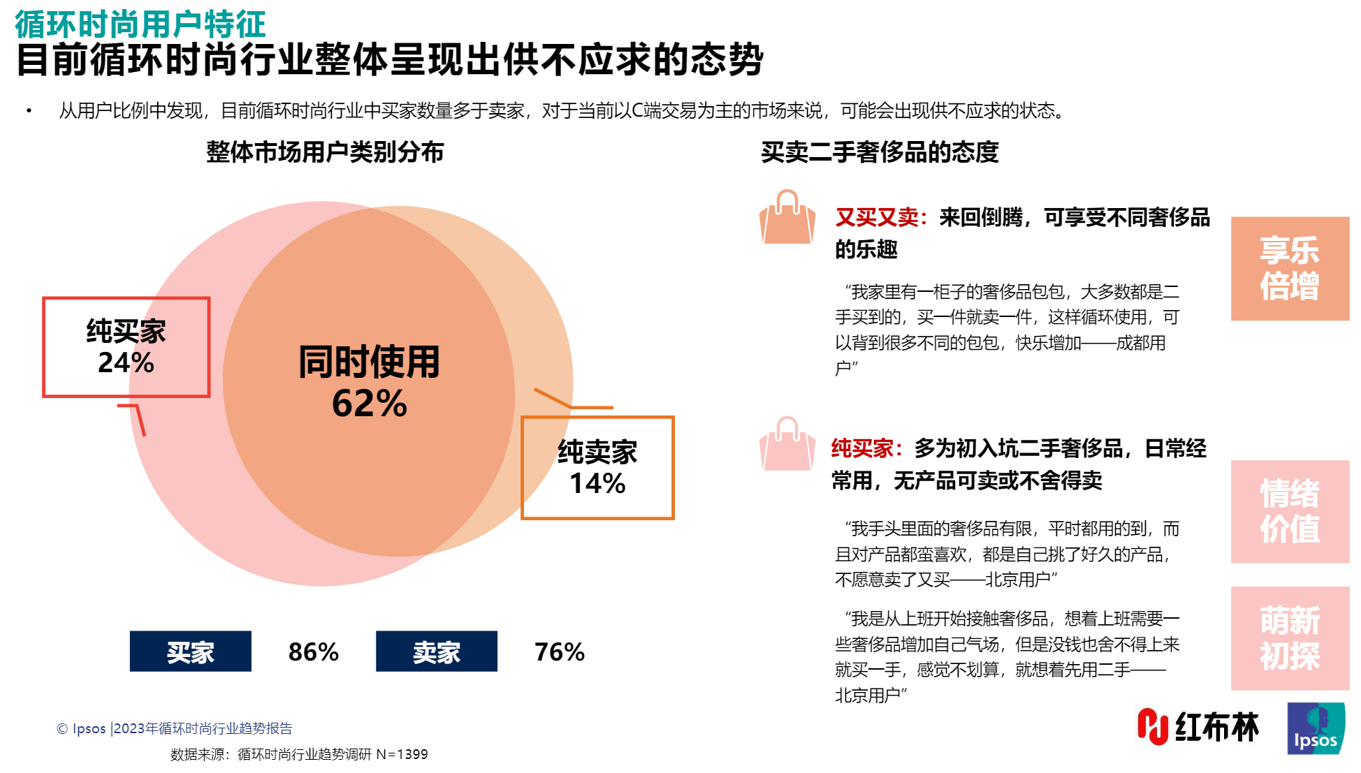 报告显示,循环时尚整体市场呈现“供不应求”的态势。市场上有24%的纯买家和14%的纯卖家,另有62%的用户则是“既买又卖”。