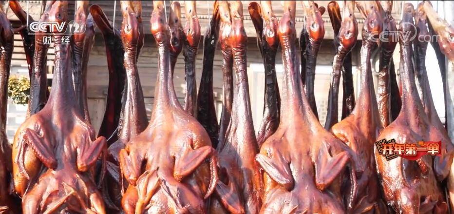 浙江德清沈记旺达腌货店老板娘罗敏:像这么大的肯定是没有了,因为是彩头,鸭王,讨个彩头,今年运气特别好。你们如果要的话,可以那边挑一下,这个是酱鸭,那个是腊鸭。
