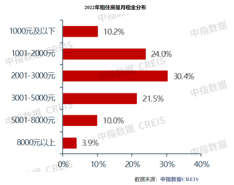 在租金水平分布上,月租金主要集中分布在1001-5000元区间,合计占比近八成,其中2001-3000元占比最高,达30.4%;其次为1001-2000元区间段,占比为24.0%;3001-5000元区间段占比为21.5%。