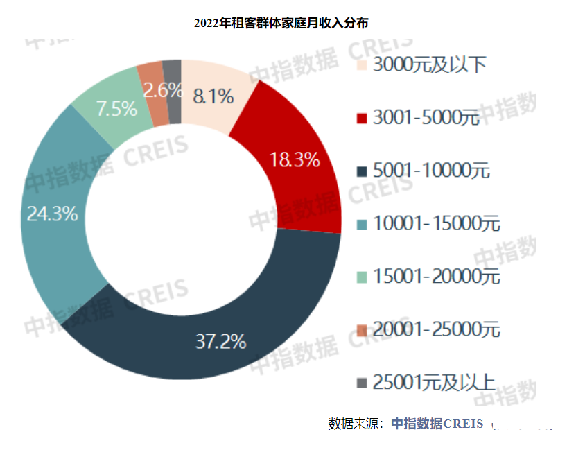 从家庭月收入情况来看,超过60%的租客家庭月收入低于万元,其中家庭月收入在5001-10000元的租客群体占比最高,为37.2%,合计26.4%的受访租客家庭收入不足5000元,收入在10001-15000元的租客占比24.3%,家庭收入超20000元的占比不及5%。