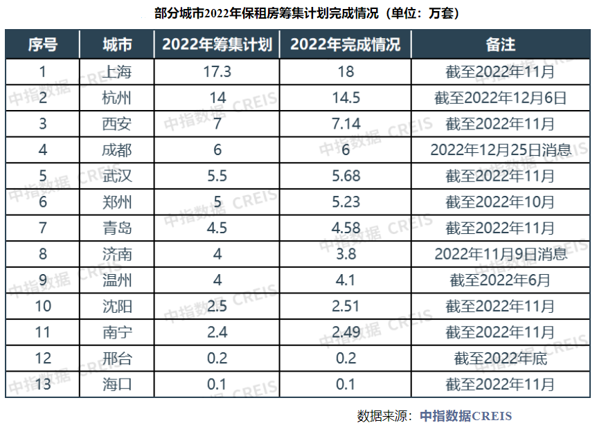 住建部统计数据显示,2022年1-10月,全国保租房已开工建设和筹集233.6万套,占年度计划的98.8%,多省市已提前或超额完成2022年预定目标。
