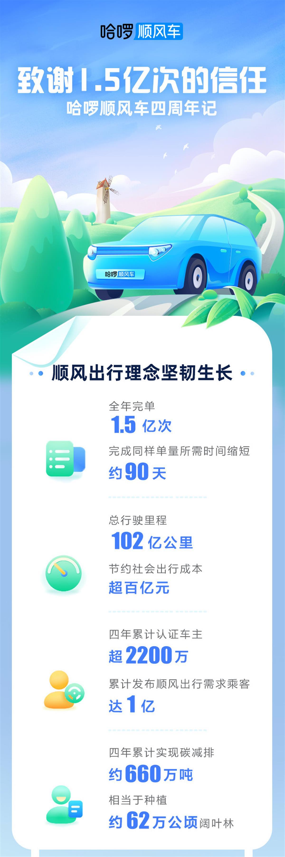 通过顺风车推动合乘,提高道路使用率,疏解早晚高峰拥堵等现象,顺风车也成为城市出行结构改善的一个选择。哈啰数据显示,四年间累计顺风出行总里程超过300亿公里。通过一次次微小的空座分享,减少或替代个体私家车出行,实现碳排放减量约660万吨,数以千万的车主和用户共同铸就了一座绿色里程碑。