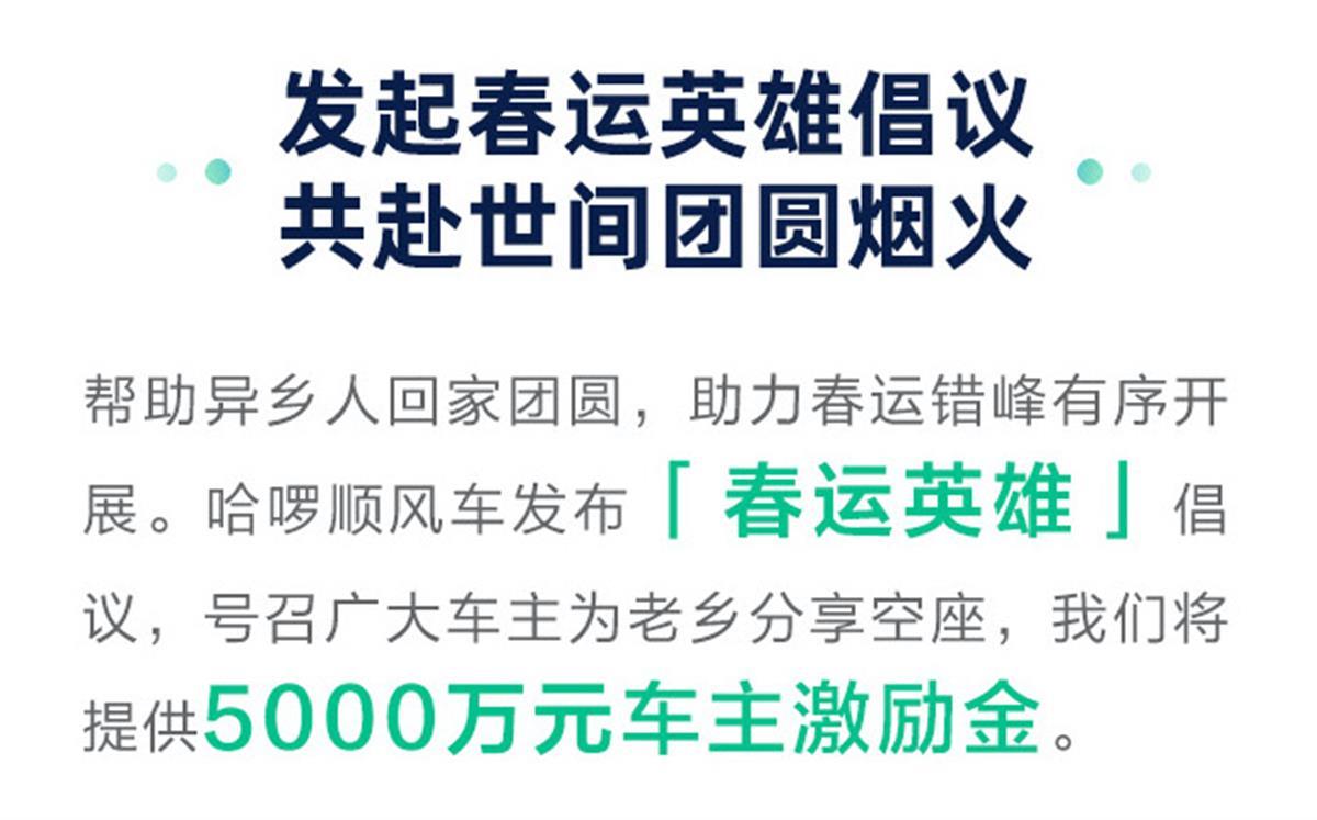 哈啰顺风车将会提供5000万元的车主激励金,鼓励车主老乡分享空座,帮助异乡人回家团圆,助力春运错峰、有序开展。