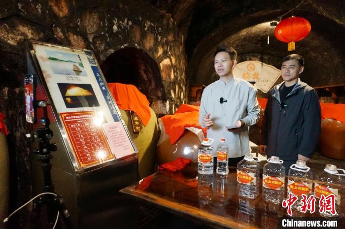 1月14日,直播团队在象山酒窖内进行直播,为现场下单的网友装酒。 欧惠兰摄