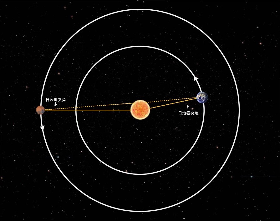 火星日凌期间,地球、火星与太阳之间的位置关系示意图。(受访对象供图)