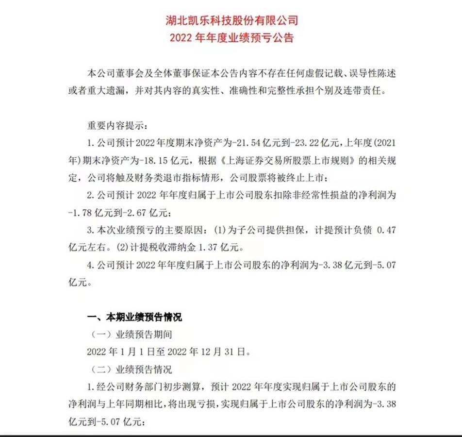 *ST凯乐或成今年沪市首家退市公司。近日,*ST凯乐披露2022年年报业绩预告。该公告显示,公司预计2022年度期末净资产为-21.54亿元到-23.22亿元,2022年年报披露后,公司将触及财务类退市指标而被终止上市。市场分析人士指出,考虑到公司控股股东深陷债务危机与诉讼泥潭,*ST凯乐退市已是“板上钉钉”。