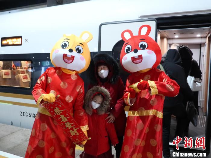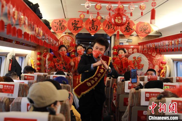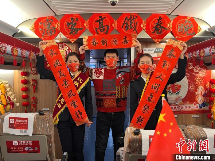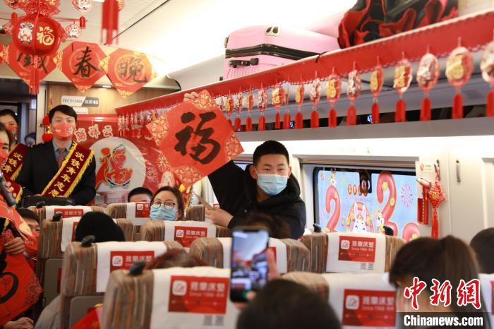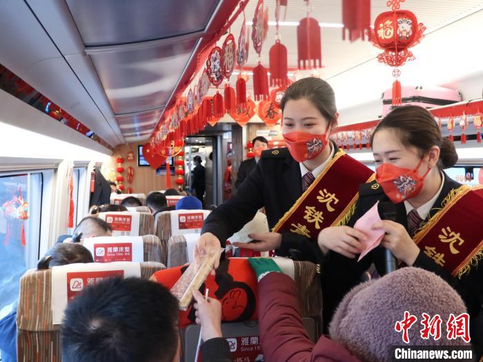 中新网沈阳1月14日电(李晛王志松李晶)1月14日,腊月二十三,中国北方地区进入传统节日——小年。为迎接小年的来临,沈阳铁路局沈阳客运段举办了一场以“玉兔闹新春,沈客伴您行”为主题的联欢活动。在丹东开往上海虹桥的G1230次列车上,浓郁的年味在车厢中弥漫,让旅客踏上了不一样的回家之路。
