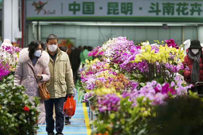 近日,市民在昆明市斗南花市选购花卉。新华社发(郝亚鑫摄)