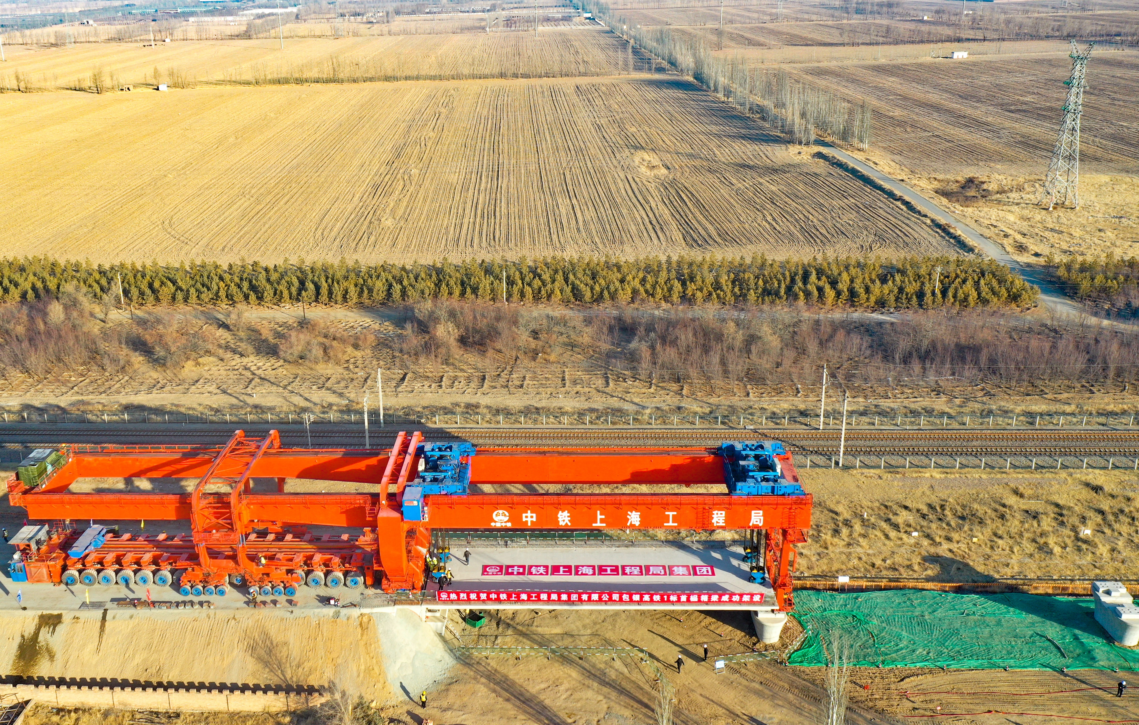 ▲2022年12月5日,内蒙古包头,中铁上海工程局施工机械在包银高铁包头段跨万甘铁路特大桥首孔箱梁架设现场作业(无人机照片)。图/ICphoto