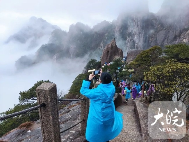 福建游客叶雪娟和家人都是第一次登黄山,激动地在各个景点前打卡拍照,她表示,一家8口人来黄山过年也是有一种团圆,春节黄山的气氛很好,人也很多,有今天点雾,拍起照来像一幅水墨画,特别漂亮。春节假期,家庭游游客明显增多,很多游客带孩子和老人举家游览,在黄山之巅共享团圆年。来自浙江的游客陈海燕说:“黄山是全家都向往已久的地方,大儿子三年级时就在语文课本里学过黄山,这一次也让他亲身感受一下课本里的美景。”目前,黄山风景区已在部分易结冰路段提前抛洒防滑沙、增设提示牌,同时采取提前上岗、提早运营、分时换乘、延时服务等举措,障游客安全游、放心游。据景区气象部门介绍,大年初三到初六,黄山风景区以晴好天气为主,日出、日落概率60%左右,可见雪景,请来山游客注意防寒保暖。