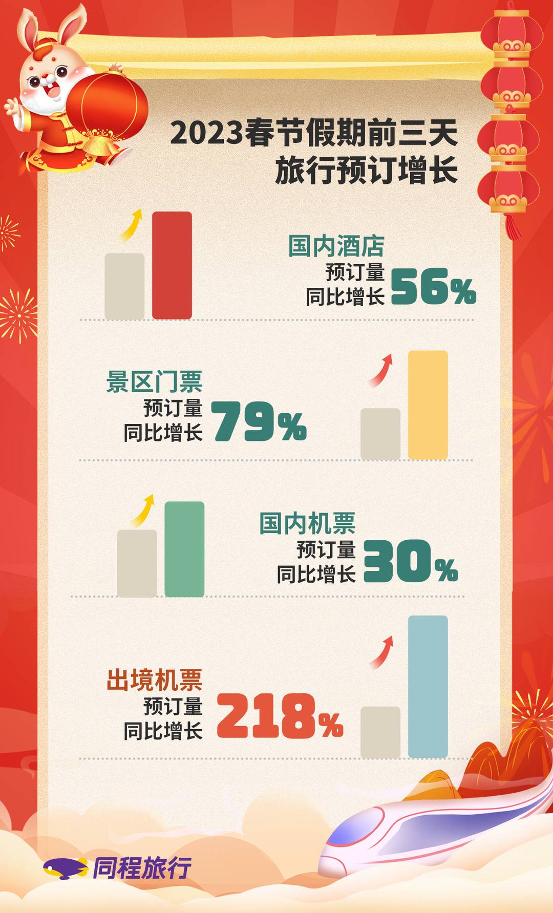 同程旅行数据显示,今年春节假期前三天,国内酒店预订量同比增长56%,景区门票预订量同比增长79%,国内机票预订量同比增长30%,出境机票同比增长218%。飞猪数据显示,截至1月22日24点,春节假期旅游商品的预订量创三年新高。除夕、初一两天,国内机票订单量同比增长超60%,高星酒店订单量同比增长超100%,民宿订单量同比增长近200%,其中大理、丽江、厦门、三亚、杭州是新年期间民宿预订最热门城市。