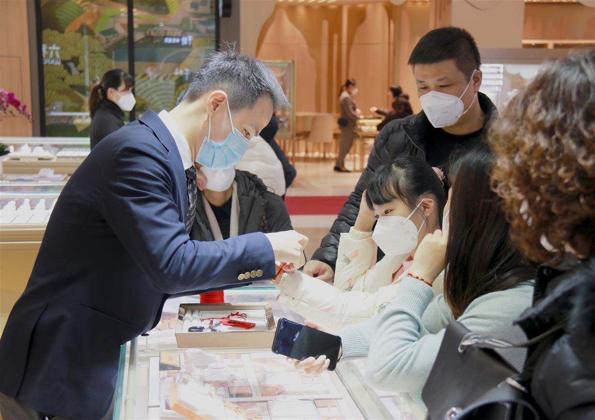 1月27日,正月初六,在武商MALL·世贸,极目新闻记者看到,不少消费者携家带口挑选首饰。