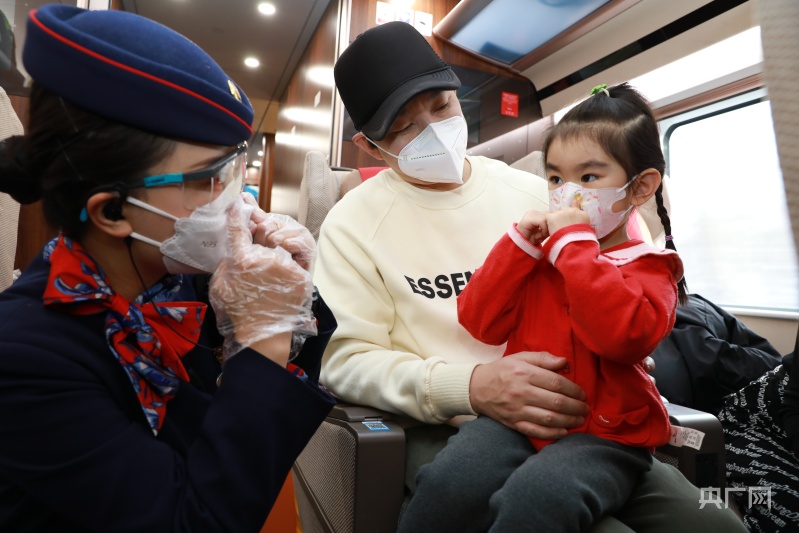 列车工作人员正在教小旅客正确佩戴口罩(央广网发宛文鹏摄)