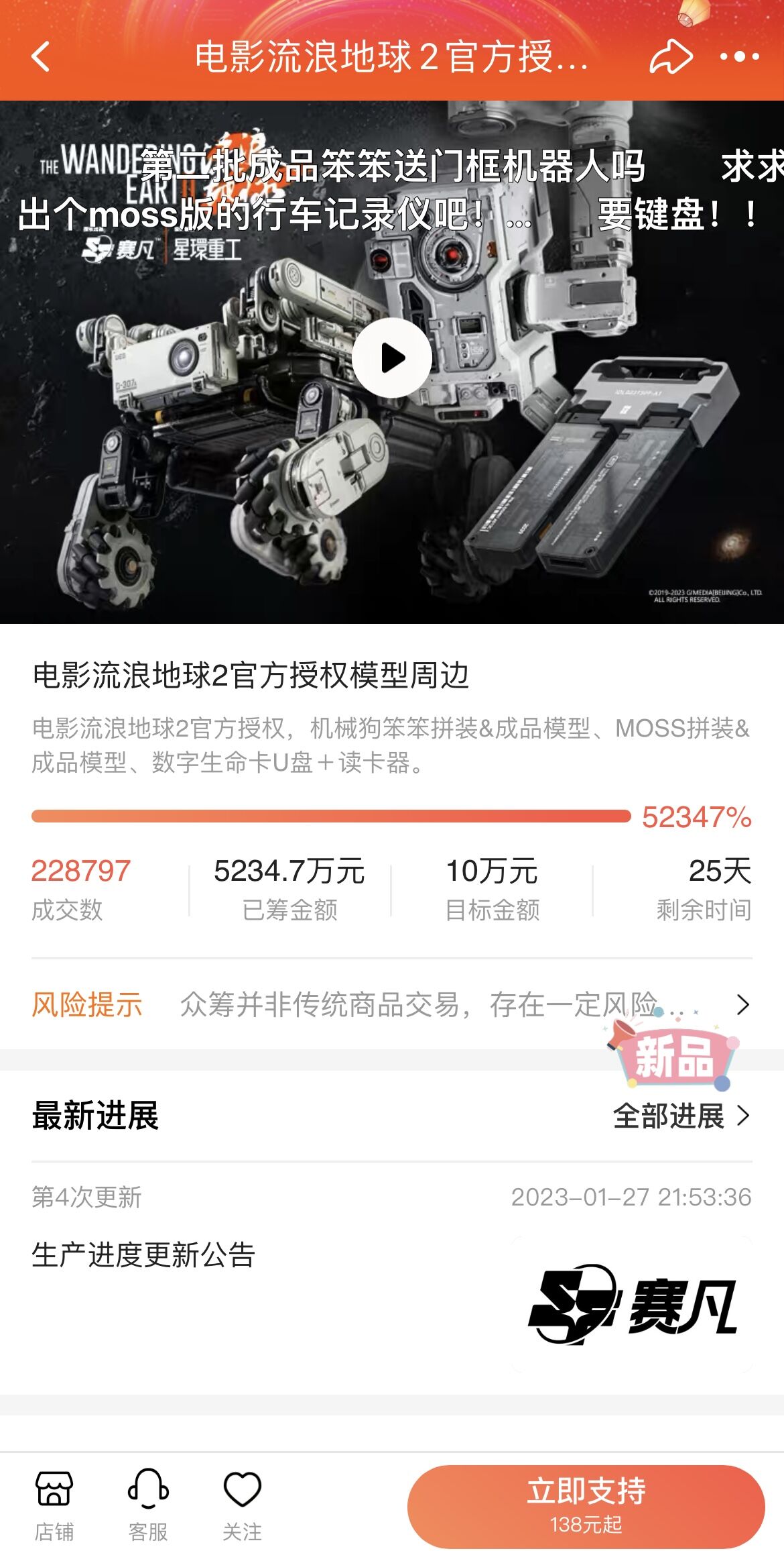 此次众筹的官方授权模型周边是《流浪地球2》和赛凡科幻空间共同推出的,共计三大类产品,包括机械狗笨笨拼装&成品模型、MOSS拼装&成品模型、数字生命卡U盘+读卡器。众筹目标金额是10万元,然而粉丝们却展示出了绝对的热情,截至1月28日下午2:30,已筹金额达到了5230.6万元,成交数为228630笔。这些模型的价格从138元-488元不等,目前近一半产品已经售罄,距离众筹结束还剩25天时间,已筹金额和成交数一直在增长。据悉,待众筹结束后,这批周边的售卖价格会略高于众筹价格。