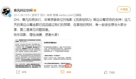 《流浪地球2》的“后劲”十足,观众对于电影的喜爱,让众筹金额屡屡攀升。日前,赛凡科幻空间在其官方微博发布“快乐观影、理性消费”的提醒。赛凡科幻空间称,“非常感激各位对电影 《流浪地球2》周边众筹项目的支持!这几天的周边众筹金额已远远超过我们的预期,在喜悦的同时,有一些话也想与大家分享。”