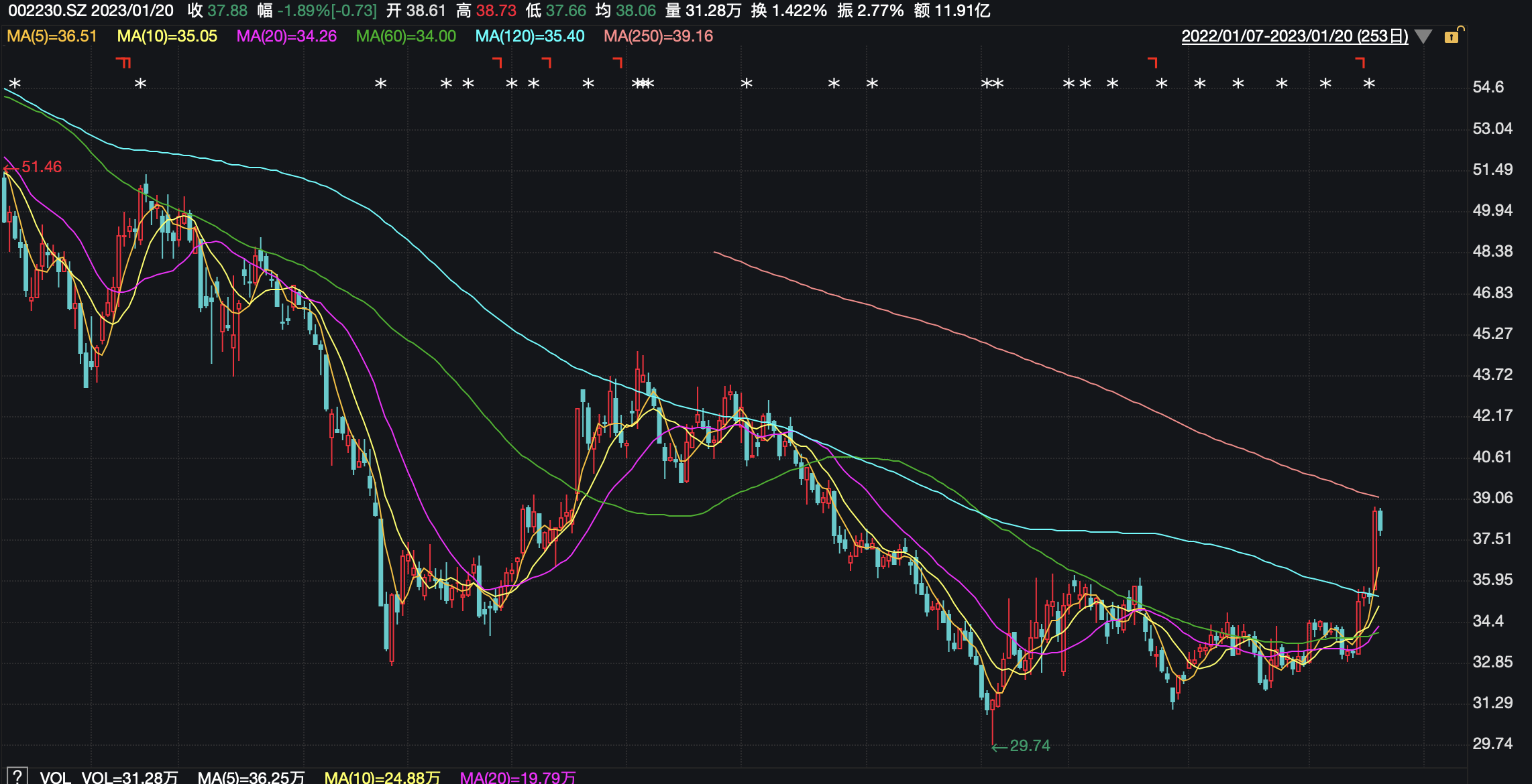 科大讯飞的股价也在近一年内下跌12.49%,截至春节前最后一个交易日(1月20日)收盘,该股报收于37.88元,微跌1.89%,总市值为880亿元。