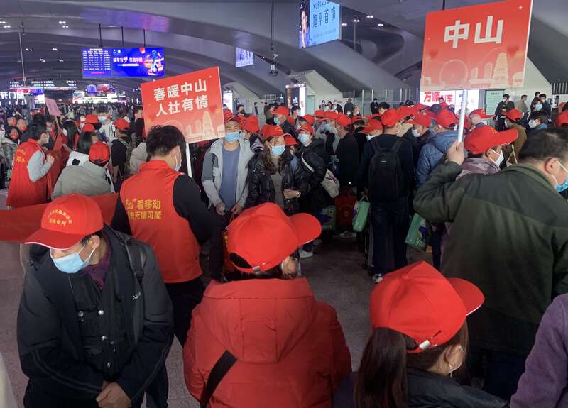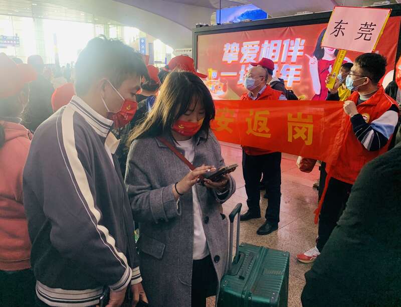 广东各地人社部门到广州南站接返岗务工人员。中青报·中青网记者林洁/摄