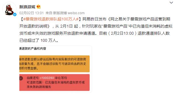 截至2月2日13时,在暴雪游戏服务中心的退款渠道中申请退款的排队人数已超100万人。