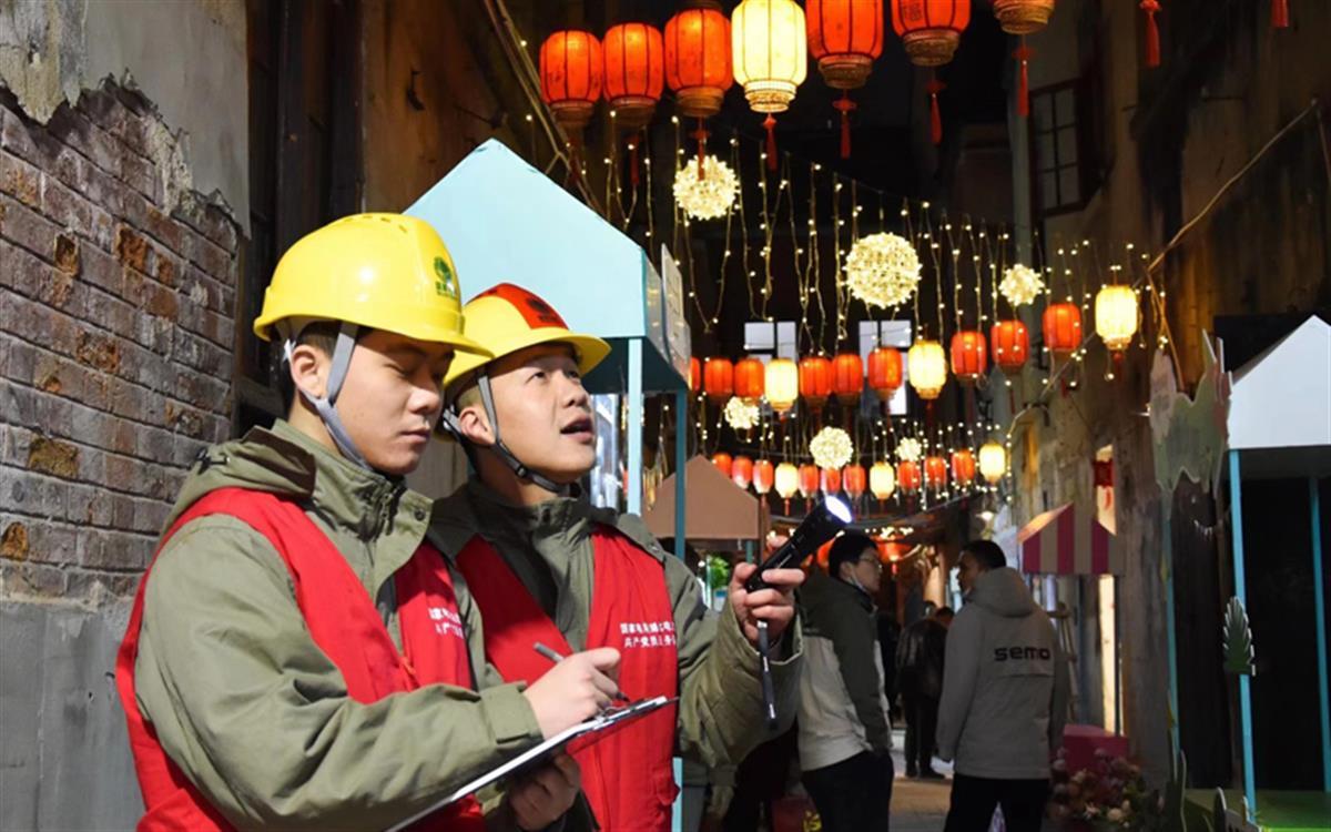 2月4日,“三阳设计之都”伴随着元宵节活动正式开街,延庆里是其重要的文化地标之一。那个往日安静沉睡着的老旧小巷已变身“网红地标”,热闹、亮堂起来。空中挂满一排排的亮闪闪的花灯,旧的房屋被装修成时髦与复古相结合的展厅。在慕名而来“打卡”的人群中,身穿红马甲的孙玉龙却没时间沉浸在这番热闹中。他和同事们再次检查了表计的安装情况,顺着巷子仔仔细细查看着供电线路,保障活动期间供电稳定可靠。