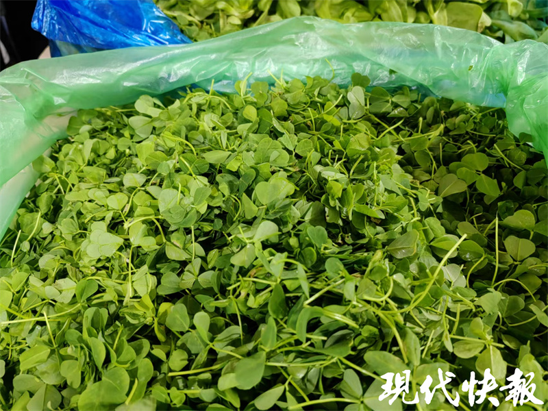 圆润鲜嫩、看起来宛如三叶草的苜蓿头十分醒目诱人。卖了十多年蔬菜的王阿姨告诉记者,这种菜还叫秧草,10元一斤。“还有一种和它长得很像的叫做豌豆苗,零售13元一斤,如果是挑选过的嫩苗,则要卖30元一斤。”