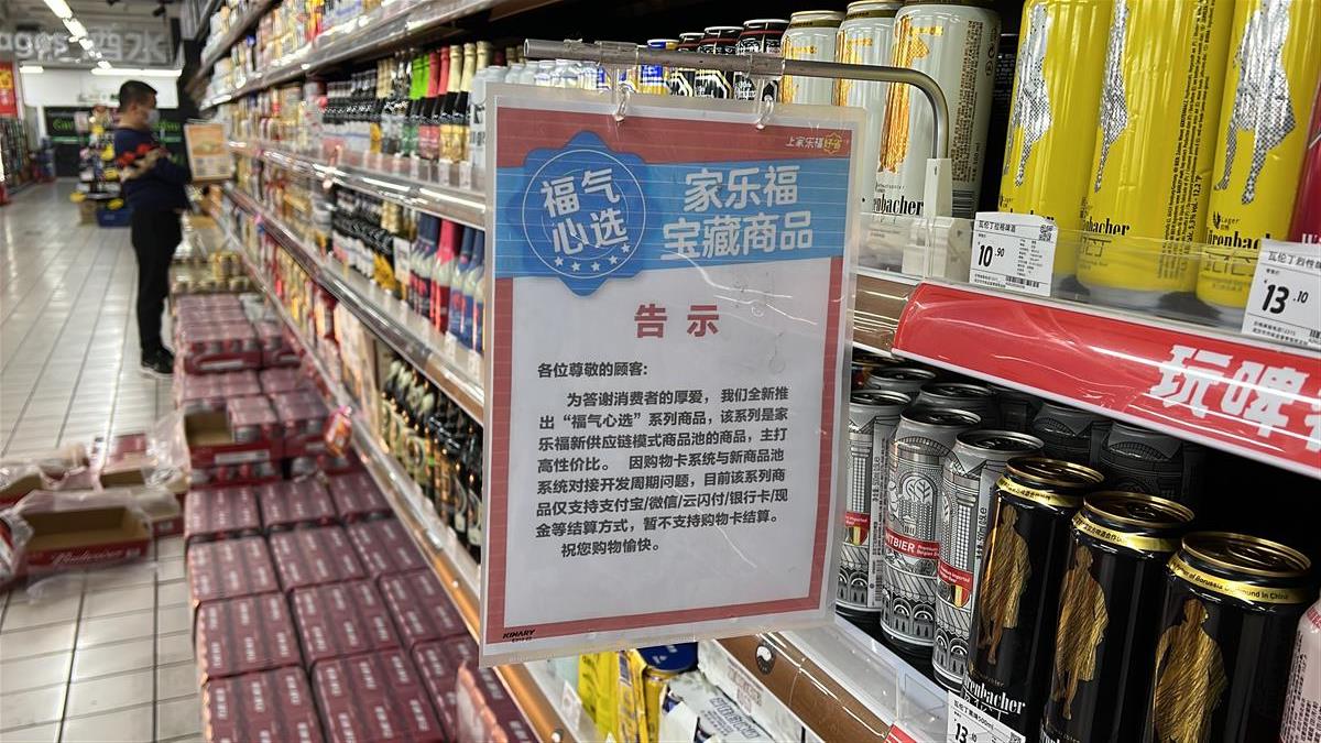 上月,极目新闻记者探访武汉家乐福光谷店和建设大道店时看到,两家店内均有不少商品货架上贴有“福气心选”标签,店内告示上写着“为答谢消费者的厚爱,我们全新推出‘福气心选’系列商品,该系列是家乐福新供应链模式商品池的商品,主打高性价比。因购物卡系统与新商品池系统对接开发周期问题,目前该系列商品仅支持支付宝/微信/云闪付/银行卡/现金等结算方式,暂不支持购物卡结算。”