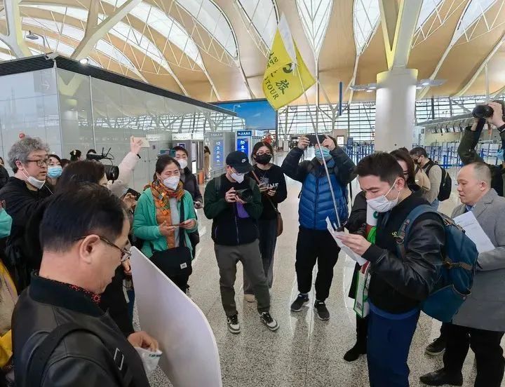 2月6日,在上海浦东国际机场,出境团队游领队师文(举旗者)向游客说明相关注意事项。