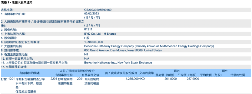 2月9日,港交所文件显示,巴菲特旗下伯克希尔·哈撒韦在2月3日售出423.5万股比亚迪H股股份,交易均价为257.9港元/股,合计套现10.92亿港元。交易之后,伯克希尔·哈撒韦仍持有1.3亿股比亚迪H股,持股比例降至11.87%。