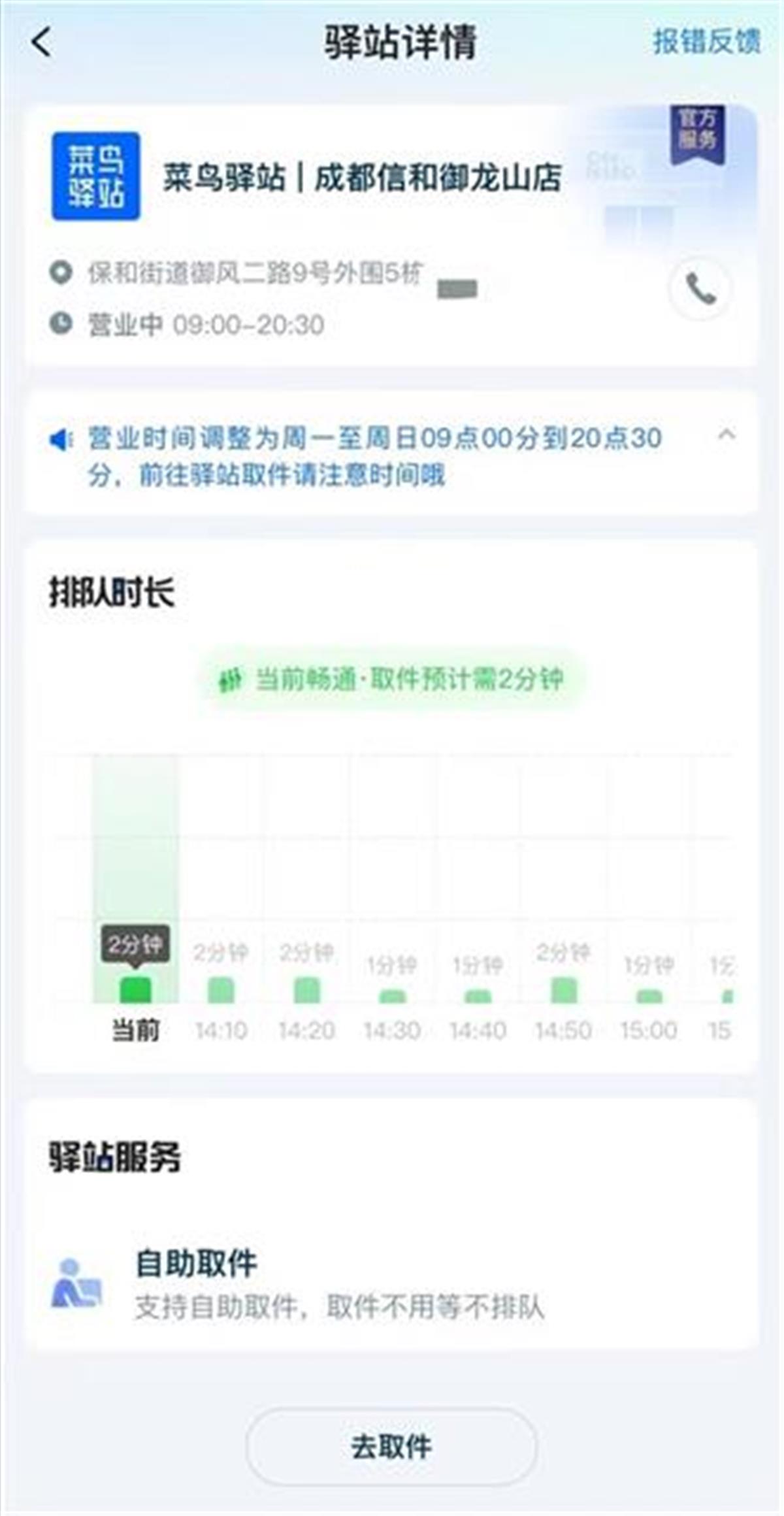据了解,该功能显示分为“畅通、忙碌、拥挤”三个状态,快递进入菜鸟驿站后,消费者登录菜鸟APP可在首页提前看到站点状态为畅通或忙碌。点击驿站信息后,还能实时查看当前取件预估时长,帮助消费者合理安排取件时间,错峰取件不用等。
