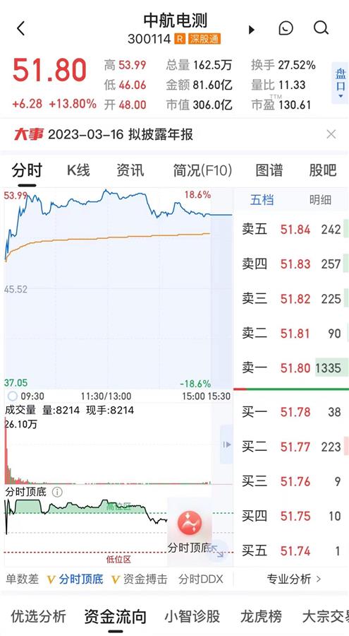 今日早盘,中航电测打开一字涨停,集合竞价阶段涨5.45%,开盘后该股继续冲高,盘中创下53.99元的历史新高,截至收盘,收报51.8元/股,涨13.8%,最新市值为306亿元。