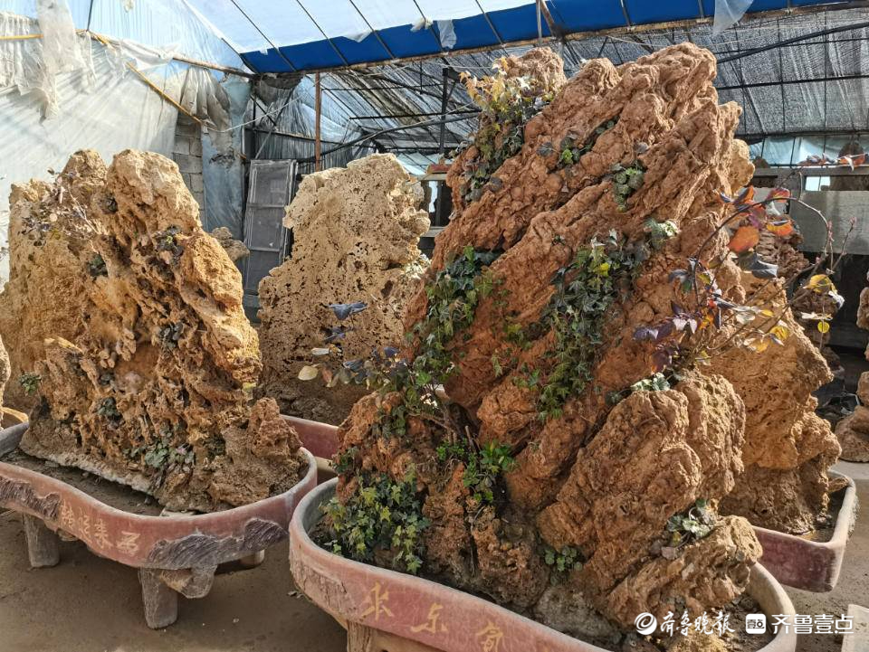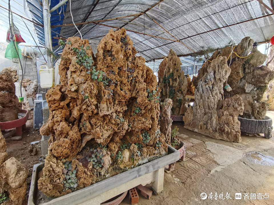 在刁宗玉的上水石园里,放眼望去仿佛置身电视剧《西游记》里水帘洞内的奇石景象,各异石头一下就抓住了来访者的眼光。不同于南方上水石布景的温婉细腻,水泉镇的上水石更多是刁宗玉这样的山东大汉,挥动着尖头铁锤,对棱棱角角的天然雕饰。如果能静下心来观察,石头上还能看到各类植物的树叶化石,甚至于树枝、树根枯槁的模样。刁宗玉介绍,和王庄村紧挨的上辛庄村就产优质带有树叶化石的上水石。“我们一般会根据需求进行分割后再雕琢布景,摆件的加就能让石头更加灵动。原本风貌就能达到要求的,简单放点绿植,就是上品了,价格也能更高一些。市场行情好的时候,一年下来都有个百十万的收入。”刁宗玉说,做上水石的人,是最懂得借势而行,顺势而动的,也正是靠着这样的处世智慧,水泉镇的上水石赢得了北京、上海、山西很多客商的认可,甚至于不少外地人,还专门自己开车到刁宗玉他们的村子,现场挑选中意的上水石。