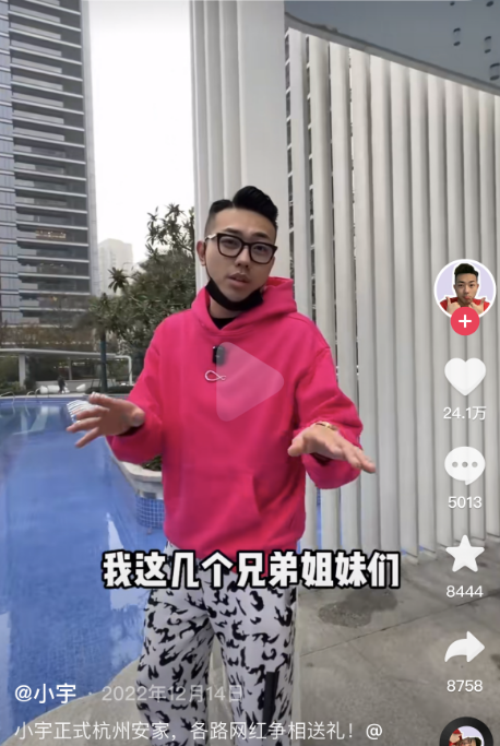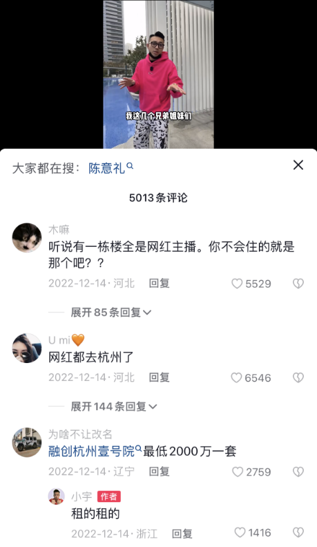 去年12月,坐拥千万粉丝的说车界网红“小宇”(曾用名“说车的小宇”)在他的抖音账号上发布了一条视频,表示接下去将正式安家杭州。视频中他的新家正是杭州壹号院,他在评论区中回复网友,目前已租住在该小区,并透露可能会有更多的网红来到这里。