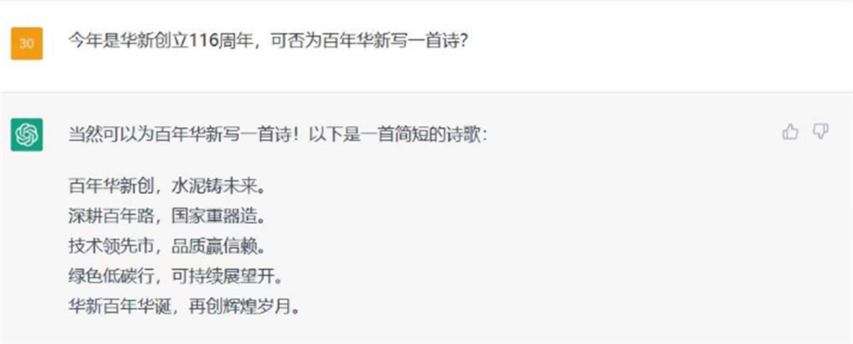 最近,被称为“全能选手”的ChatGPT火爆出圈。ChatGPT眼中的华新水泥,是怎样的百年品牌老字号?2月17日,楚天都市报极目新闻记者联系一位在国外留学的中国学生,请他帮我们问了ChatGPT几个问题。ChatGPT还为百年华新写下了一首诗。其高智商高情商的回答,令人叫绝。
