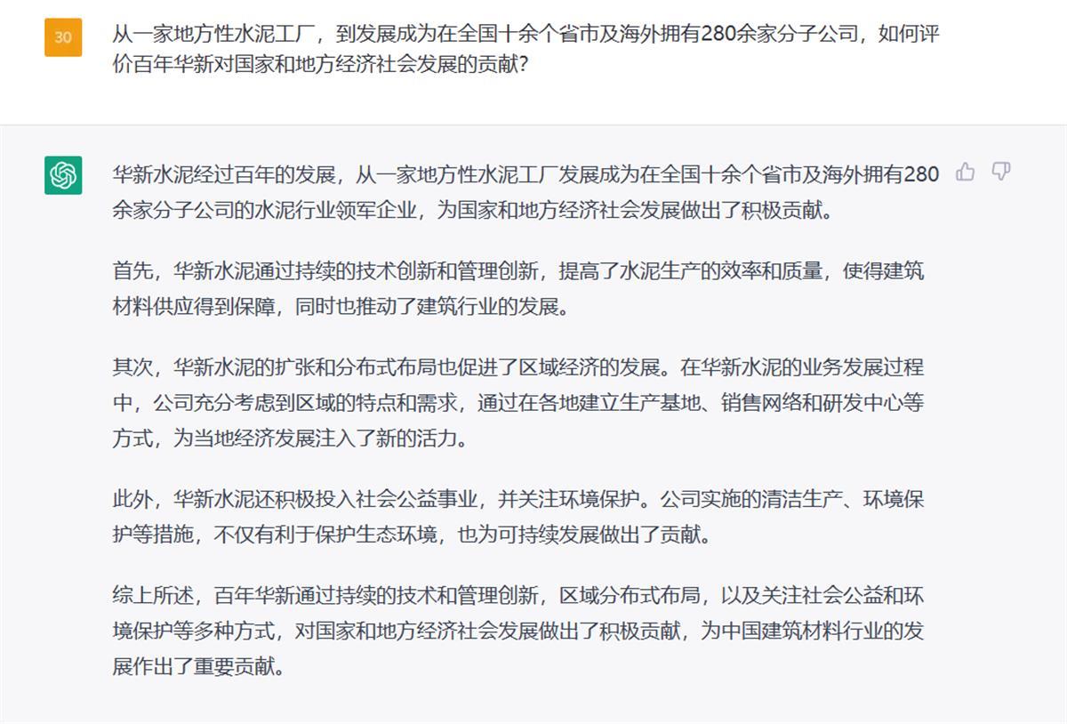 ChatGPT:华新水泥经过百年的发展,从一家地方性水泥工厂发展成为在全国十余个省市及海外拥有280余家分子公司的水泥行业领军企业,为国家和地方经济社会发展做出了积极贡献。