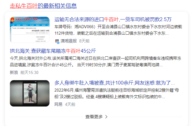 最近,各地海关、边境、海警等部门发布了一些走私牛肚的案子。