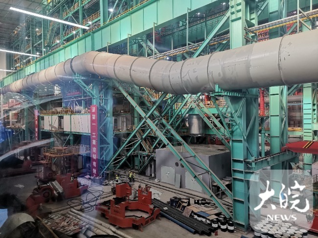 大皖新闻讯2月16日上午,新时代新征程新伟业专题采访团在马鞍山感受钢铁巨人前进的步伐。宝武马钢新特钢工程项目正在紧张施工中,去年11月份刚刚完成倾动仪式的1号转炉,一次可以“吃”下150吨钢水;特钢智控中心里,大屏幕上闪烁的画面和跳动数字显示着一线生产全部流程,科技的力量让生产的前后方沟通更加顺畅。