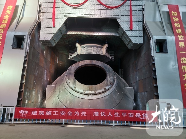 在这个钢铁巨无霸的肚子里转了一遭,感觉到了“硕大”的含义,楼层的高度在这里已经无法计量其具体尺寸。记者一行来到了一个平台上,“马钢新特钢1号转炉倾动仪式”红色条幅下,绶带飘拂。一个巨大的钢制炉体正在缓缓转动,宝武马钢特钢公司副经理龚志翔介绍,这个就是马钢新特钢1号转炉,去年11月份刚刚进行过倾动仪式。“预计,今年3月底可以进行热负荷试车。”那么,这么大一个炉子,一次可以加工多少钢水?龚志翔给出的答案是,150吨。