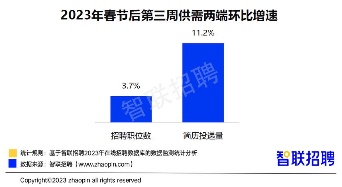 数据显示,春节后第三周,招聘求职呈现双热局面。其中,企业招聘需求持续释放,招聘职位数环比增长3.7%,人才市场求职活跃度再迎高峰,简历投递量环比增长11.2%。