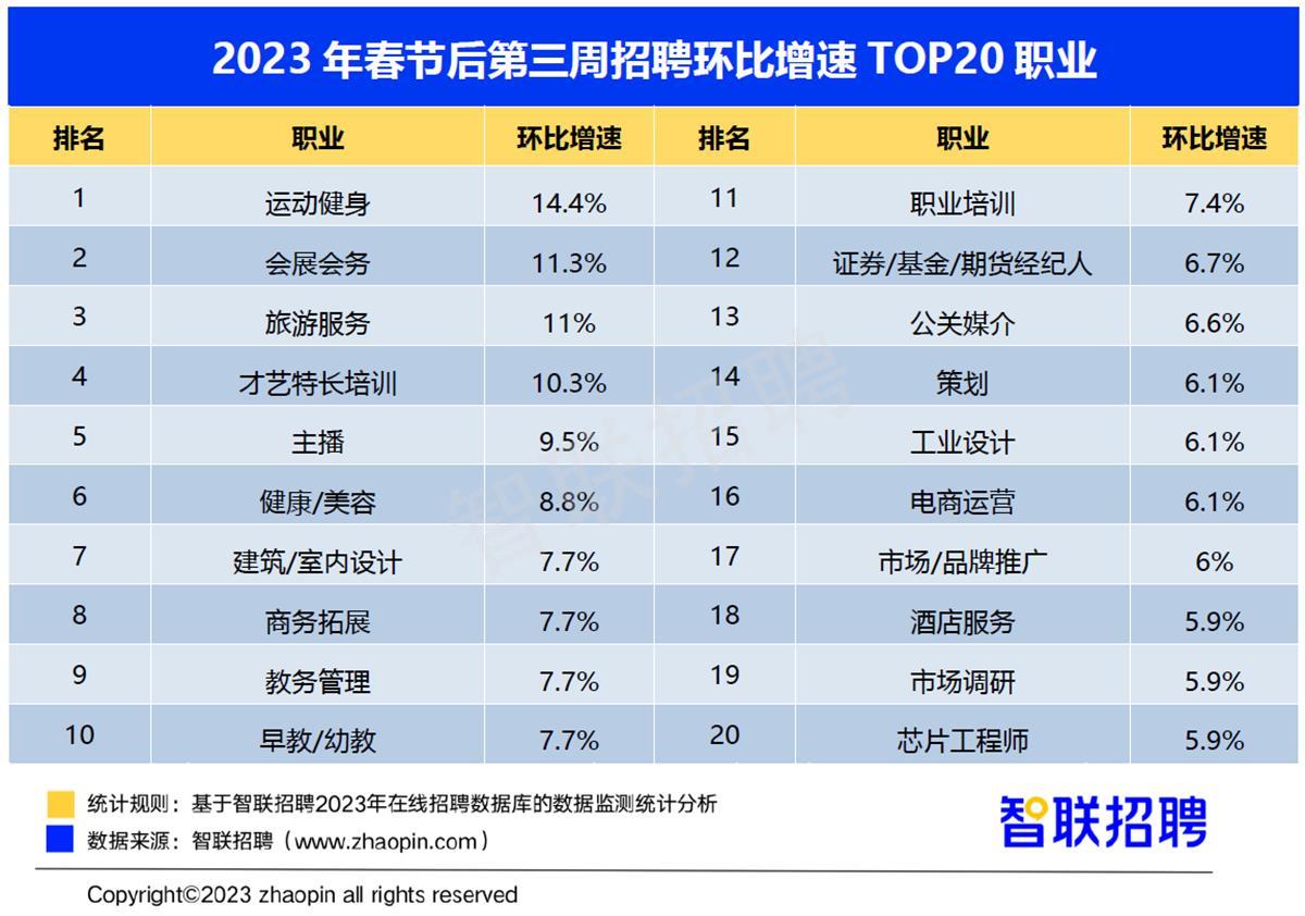 正值春招旺季,智联招聘针对就业市场的监测,每周发布《2023年春招市场行情周报》。节后第三周监测数据显示,企业复工及居民消费促进人才市场持续升温,企业招聘岗位需求进一步释放,人才求职活跃度也迎来高峰。本周还围绕“上调最低工资标准”等热点话题,调研职场人的理念想法,为招才及求职提供参考。