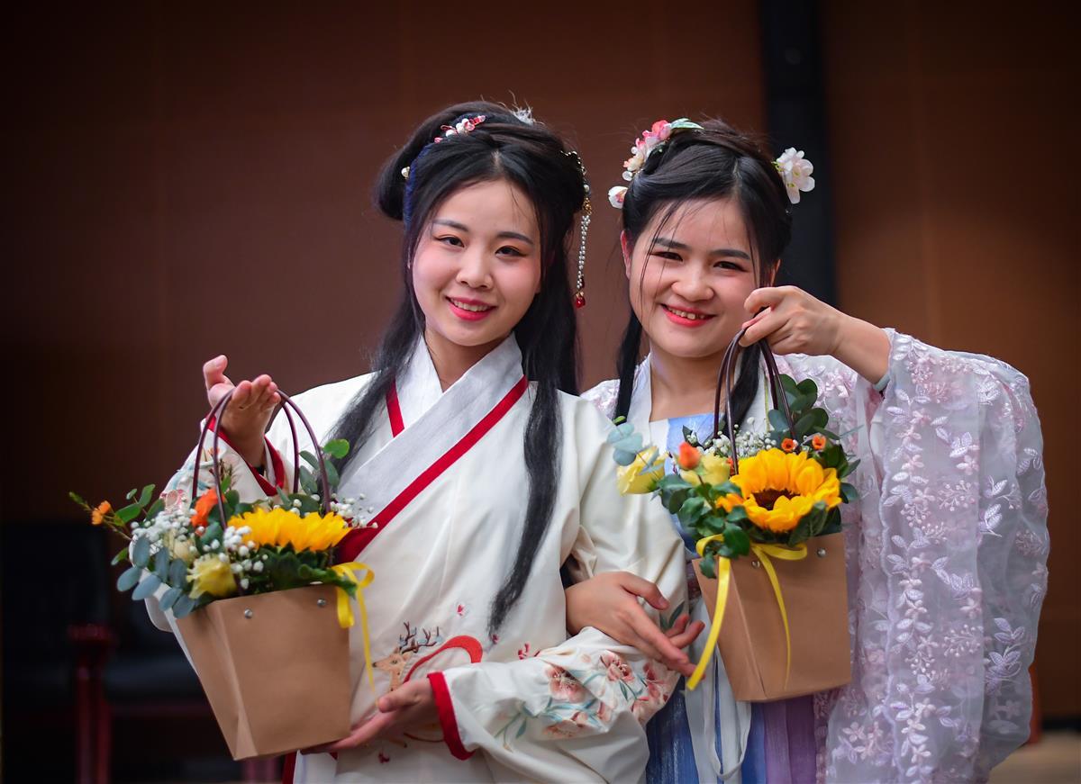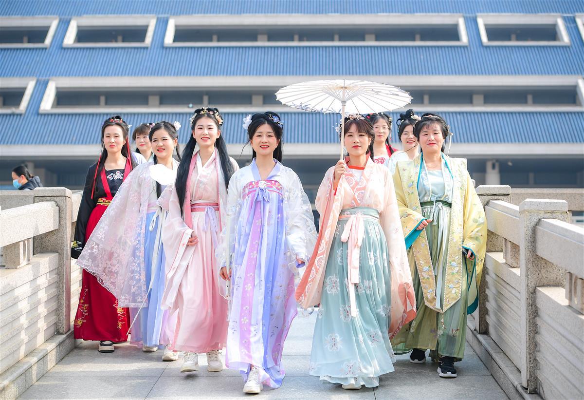 广袖飘飘、衣袂摇摇、华裳倩影……平日在工作岗位上忙碌的女建设者们换下工作服、摘掉安全帽,盘起精致的头发,戴上精美的流苏花冠,抹胭脂、画眉、点口脂、贴花钿,身着齐胸襦裙、大袖衫等服饰,从建筑“女汉子”摇身一变成为亭亭玉立的“汉服女神”。