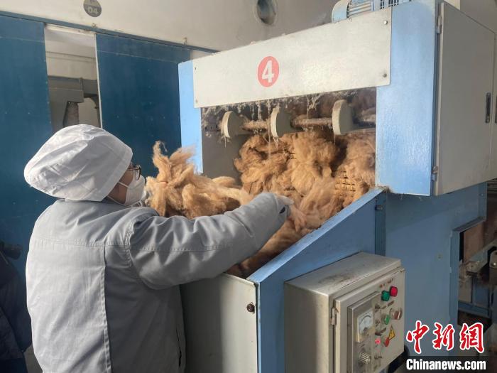 驼绒加工厂内,工人正在整理加工好的驼绒。 左丹丹摄