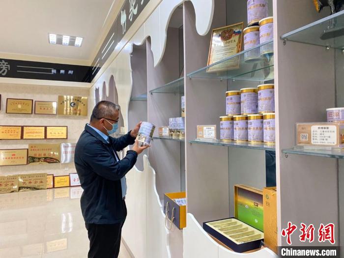 新疆一知名企业的展厅里摆放着驼奶、驼奶粉等产品。