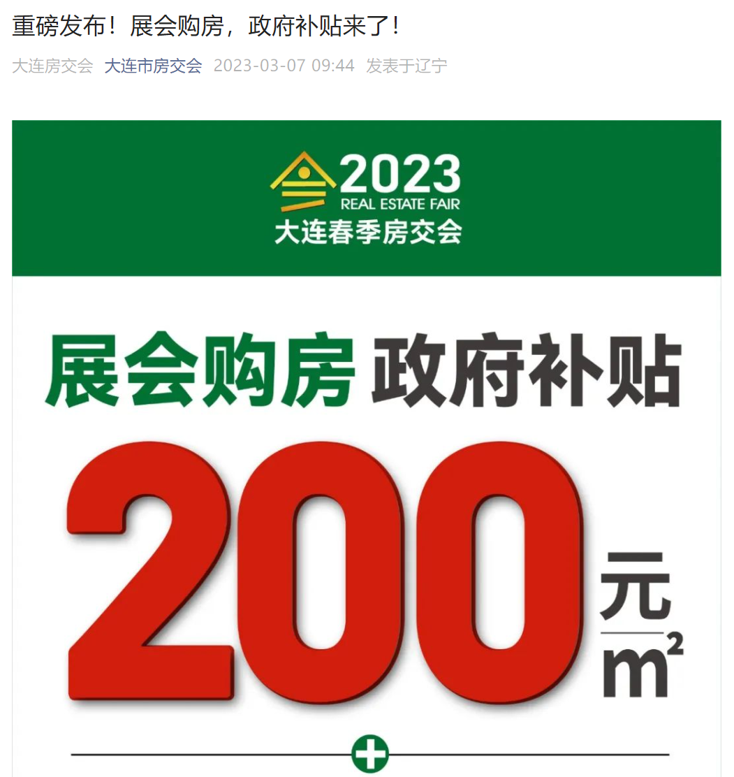 此外,据“大连市房交会”官微消息,2023年大连春季房交会将于3月15日至3月20日召开。为提振市场信心,房交会期间个人购买市内四区(中西沙甘)及高新园区参展的新建商品房,每平方米可获200元购房补贴。此外,组委会将组织开发商根据自身项目情况,提供专属房源并开展专属特价房等优惠活动。