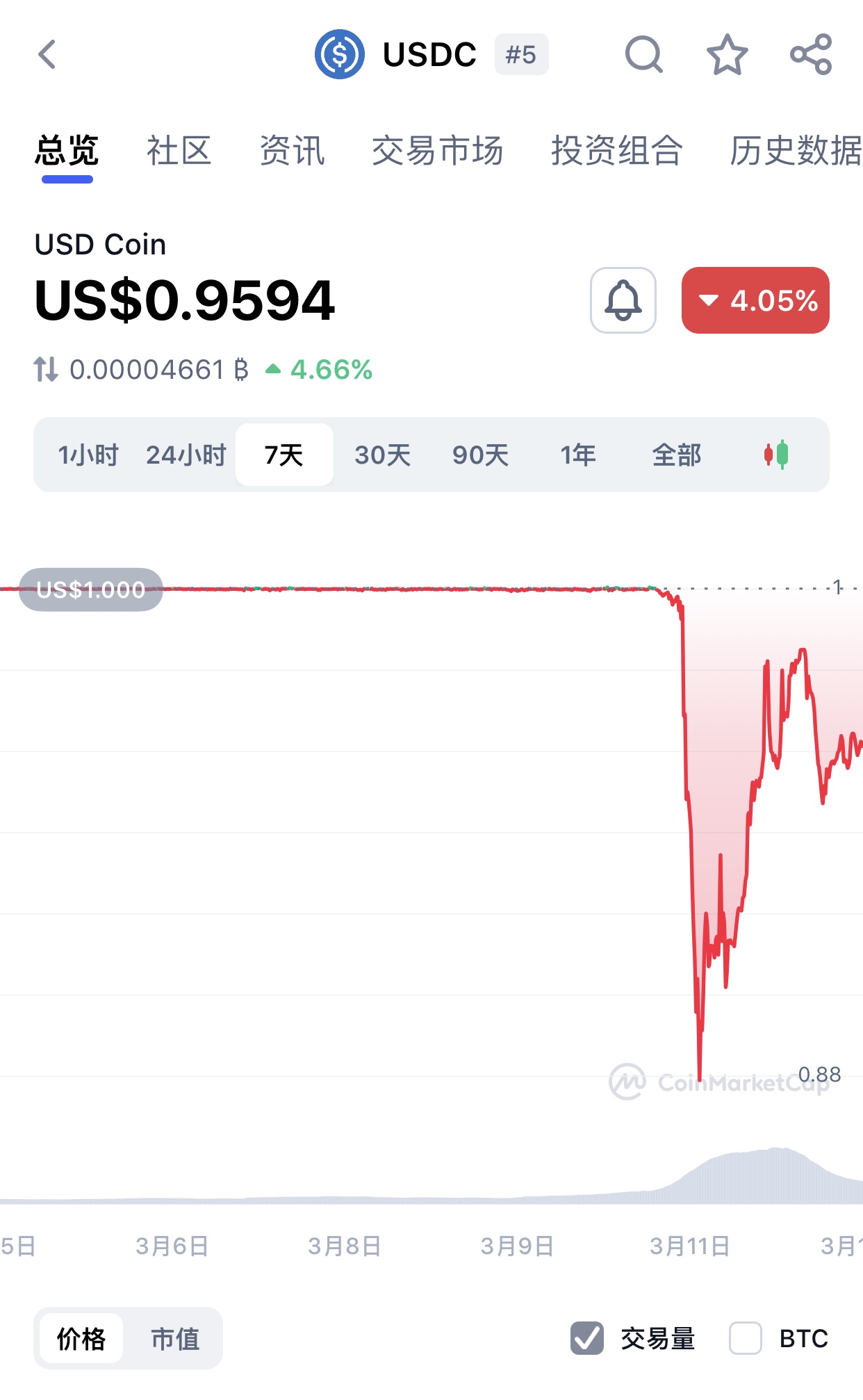 美东时间3月11日早晨,CoinMarketCap数据显示,USDC(USDCoin)一度跌破0.87美元。USDC是一种与美元1:1锚定的稳定币,价格通常稳定在1美元左右。截至发稿前,USDC市值约为390亿美元,仅次于全球第一大稳定币Tether(USDT)。