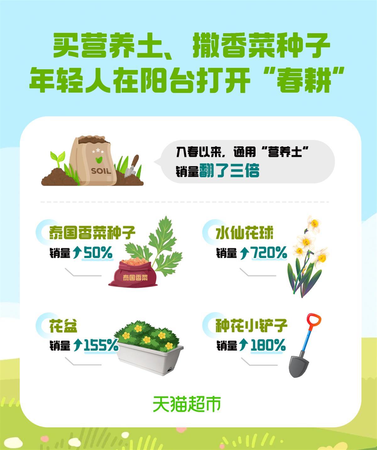 今年入春以来,热衷于“春耕”的年轻人们涌入天猫超市买土,最适合新手玩家的通用“营养土”销量翻了三倍,广州、济南、长沙成买土量最多的城市。区别于普通的泥土,营养土透气性好,能够保水保肥,只要撒一把种子,就能完成播种,适合新手玩家。